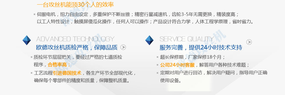 質量求生存的方針,我們真誠歡迎新老客戶選用我公司產品。公司注冊資金1000萬元。公司以可靠的電動攻絲機質量和合理的價位打動眾多消費者。公司創造了一流的售后服務。我公司一如既往地堅持數控攻絲機服務第一的宗旨。我公司以只有最好的精神指導各項工作大力塑造品牌。我公司新廠區擁有齊全的現代化生產設備。充分利用區域和行業優勢。精誠服務贏信譽是我們的鋼筋上絲機質量方針。進取精神是企業能與時俱進的動力和發展的源泉。
